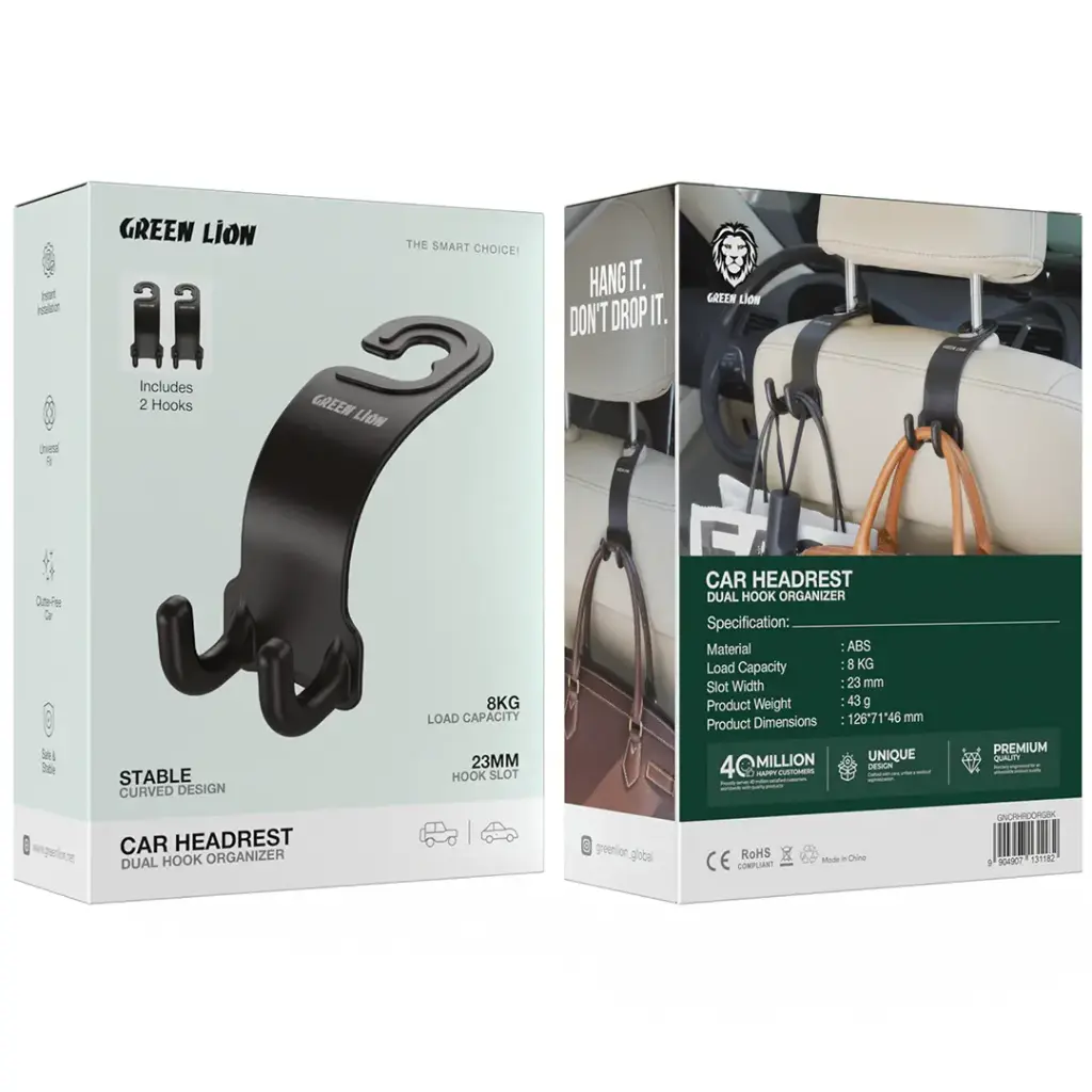Green Lion Car Headrest Dual Hook Organizer – Black