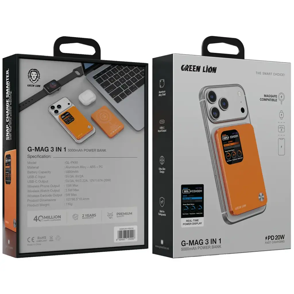Green Lion G-Mag 3 IN 1 10000mAh Power Bank PD 20W – Orange