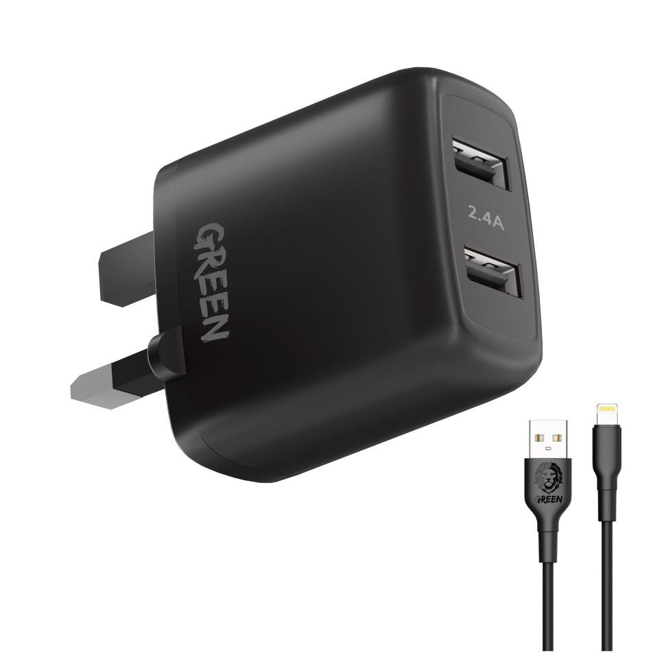 Green Lion Dual USB Port Wall Charger 12W UK with PVC Lightning Cable 1.2M-BK