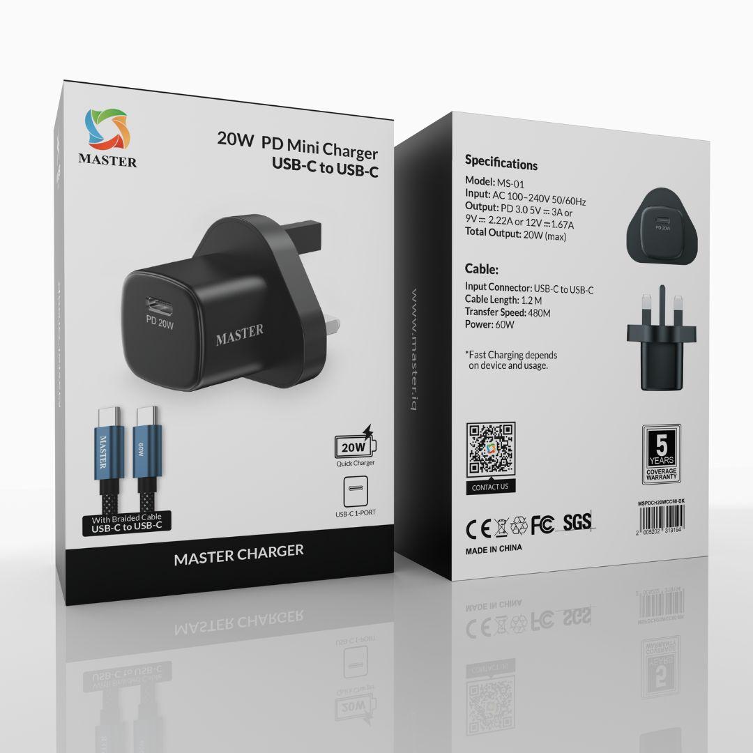 MASTER PD 20W MINI CHARGER WITH CBALE 60W C to C – Black